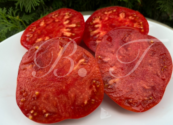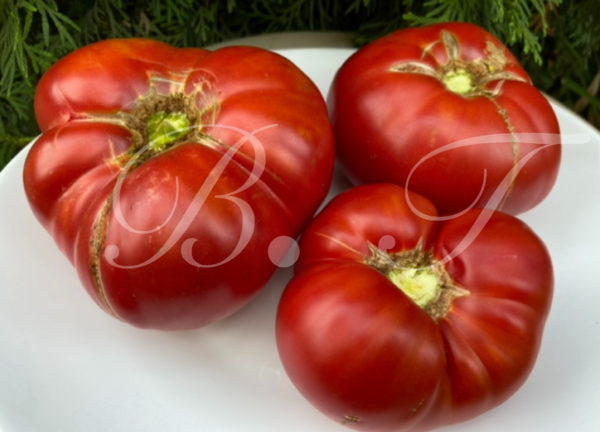 Высокорослый, среднеспелый, крупноплодный сорт. Плоды были ок. 300-400 гр., ярко-красные, с небольшой ребристостью к плодоножке. Вкус классического томата, приятного, запоминающегося. Урожайность достойная.