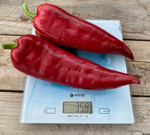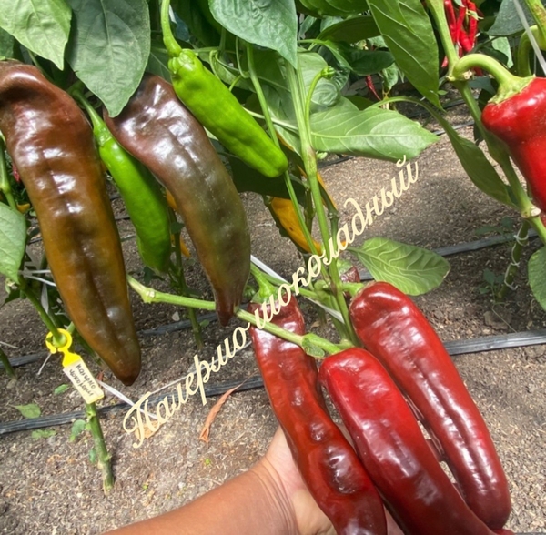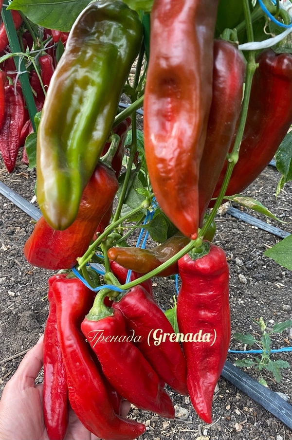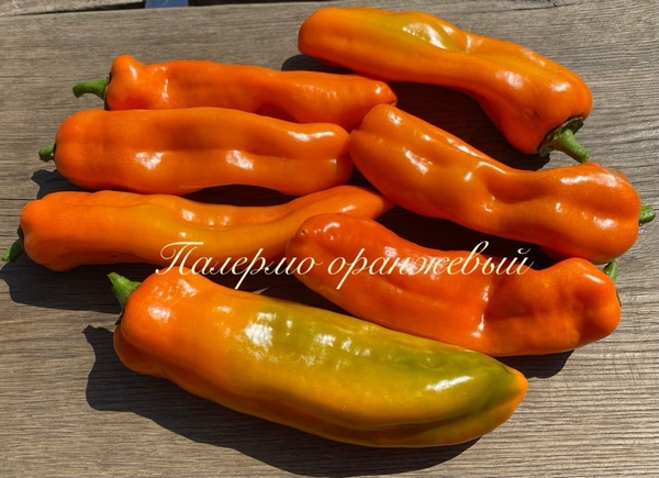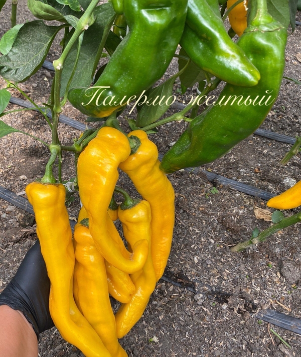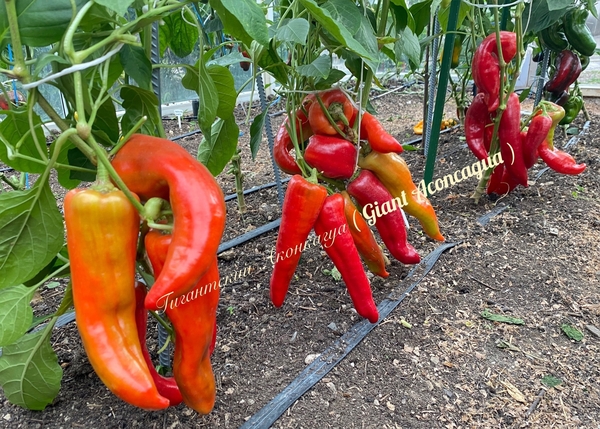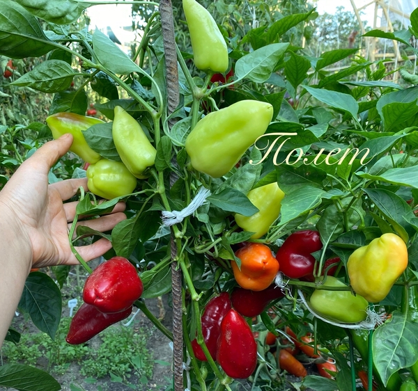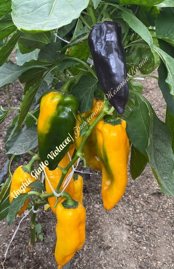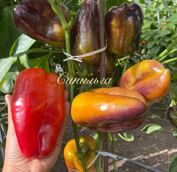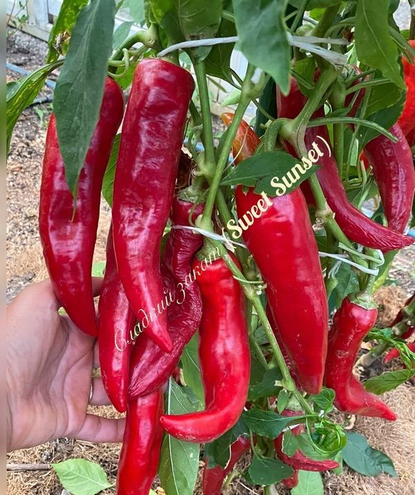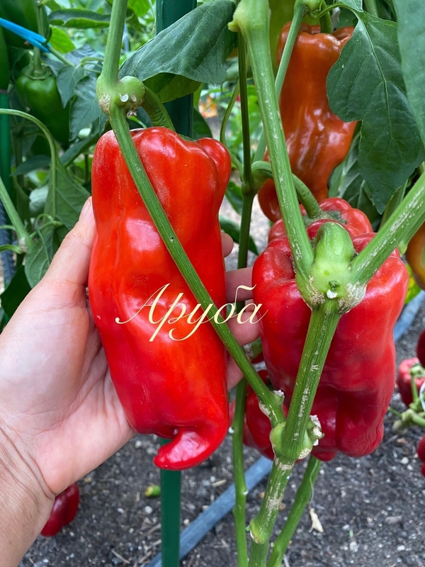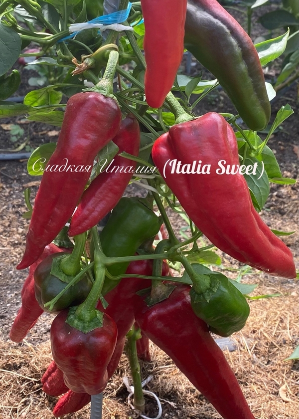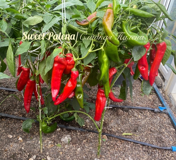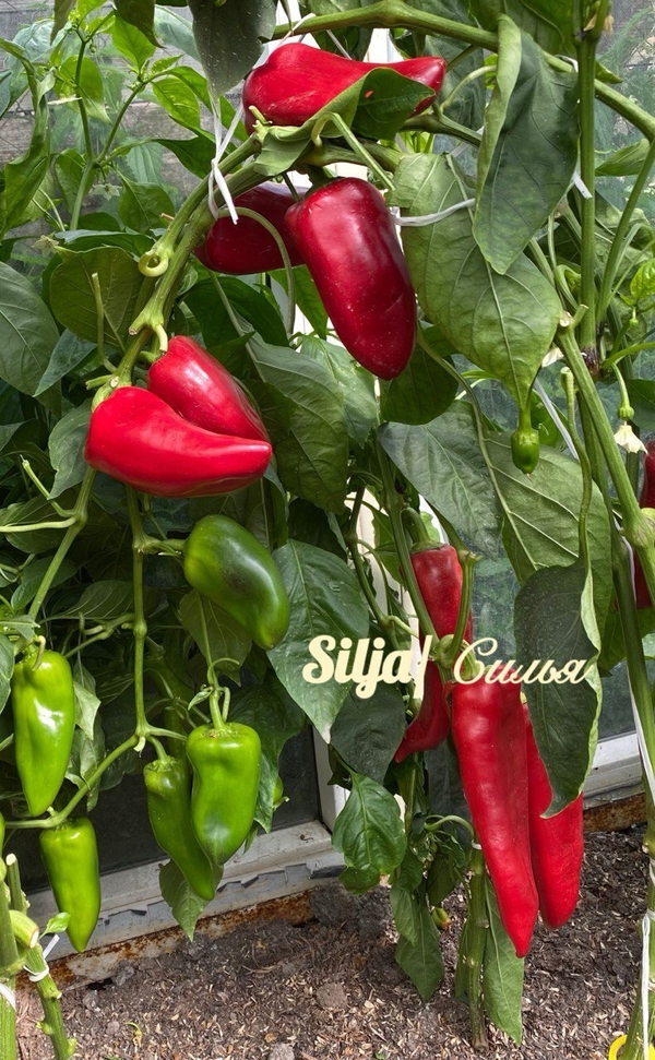 Высокорослый, ранний. Плоды длинной до 30 см., созревают от бледно-желтого до оранжево-красного цвета. Очень ароматный. Идеален для жарки, гриля, пиццы. Урожай потрясающий — куст стоит как на подпорках.