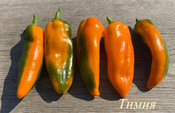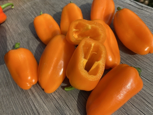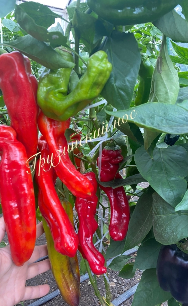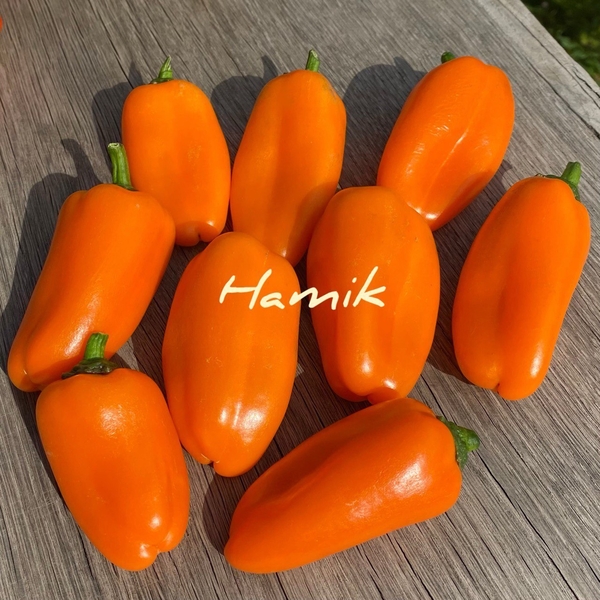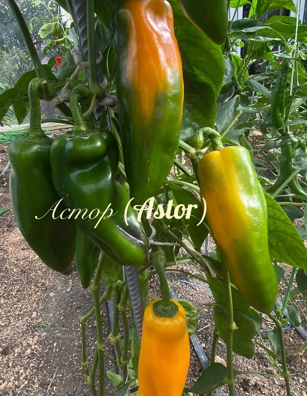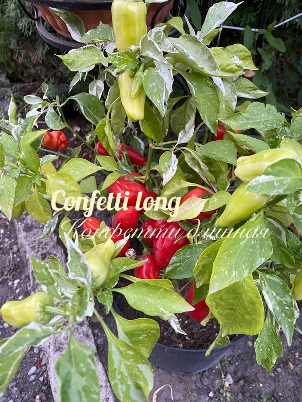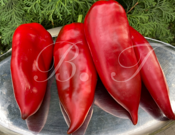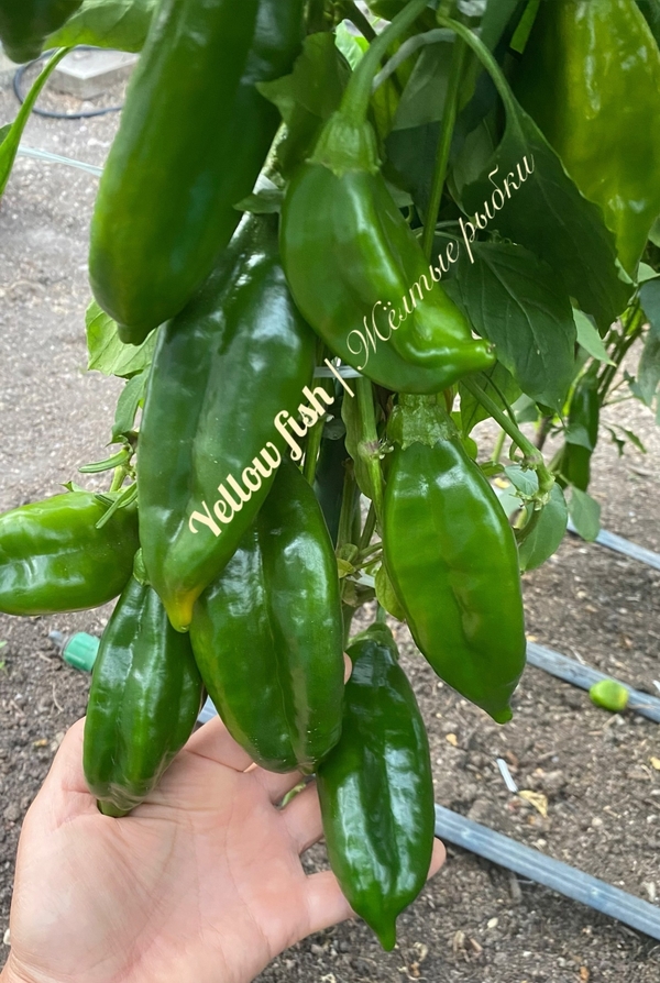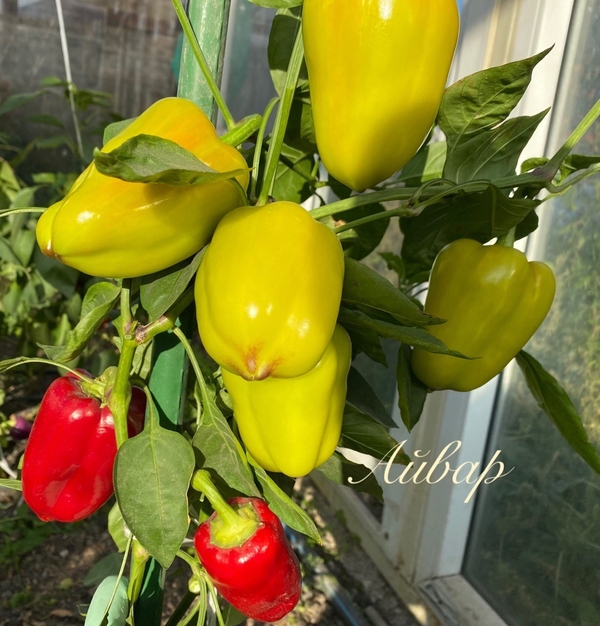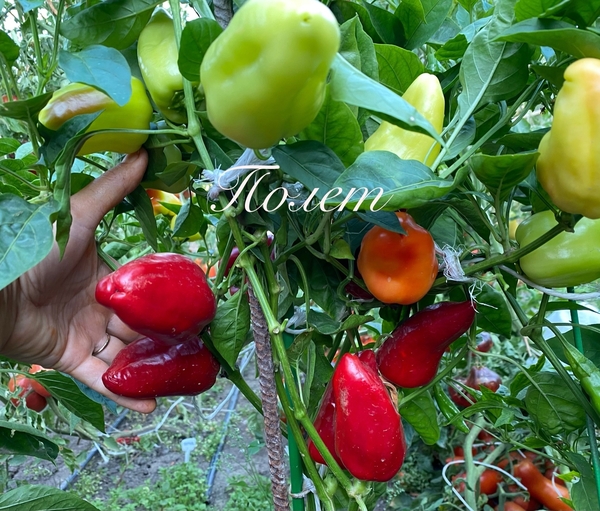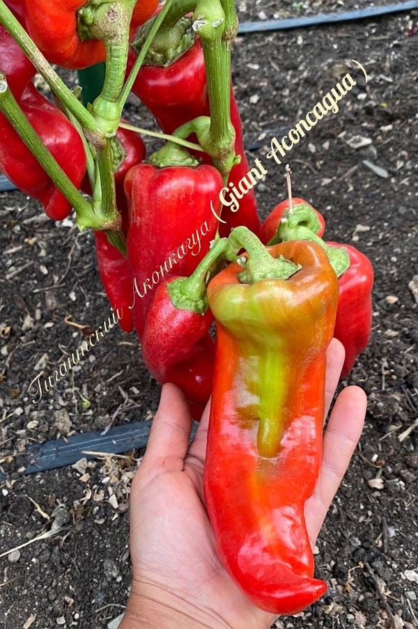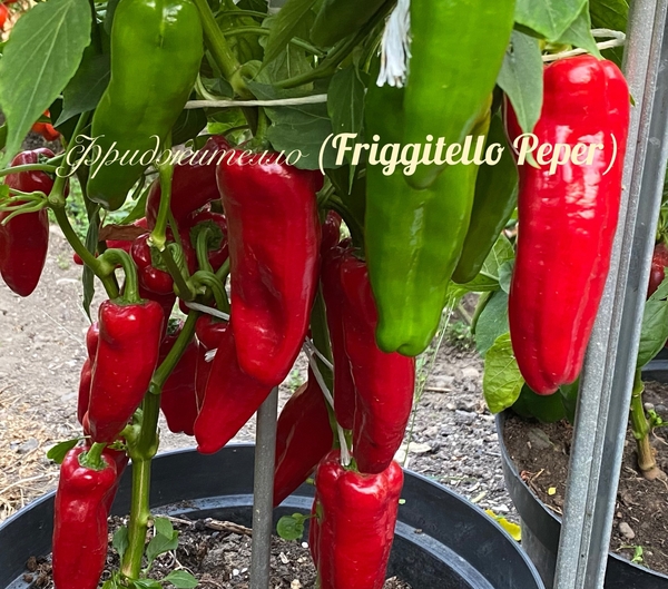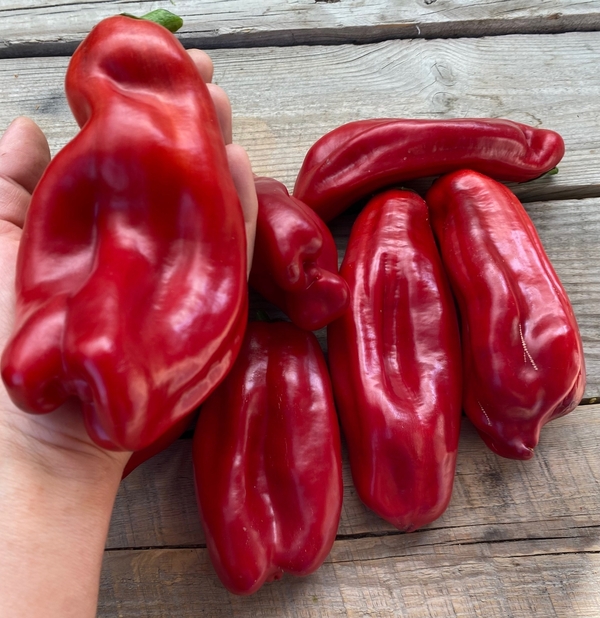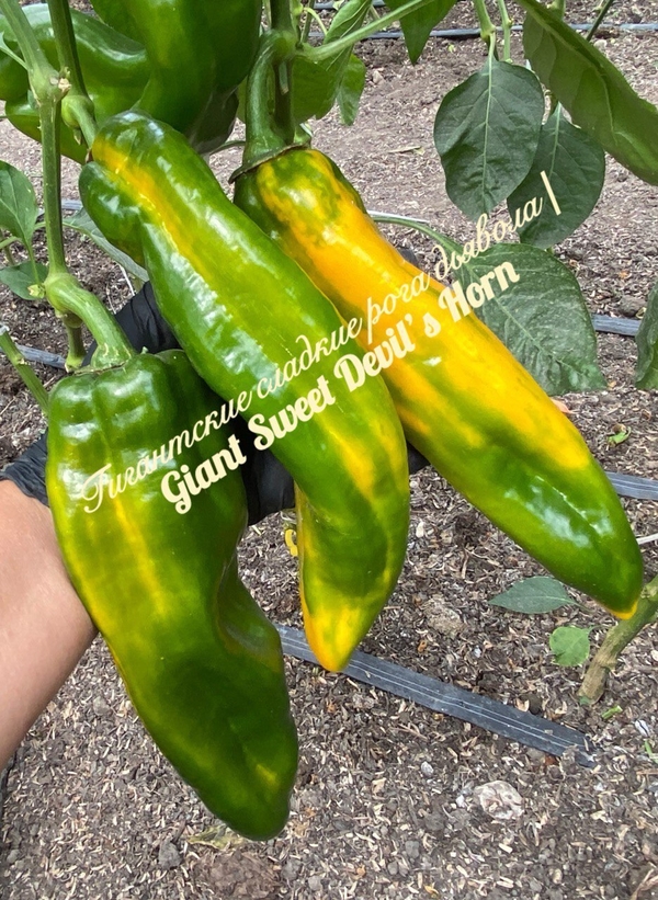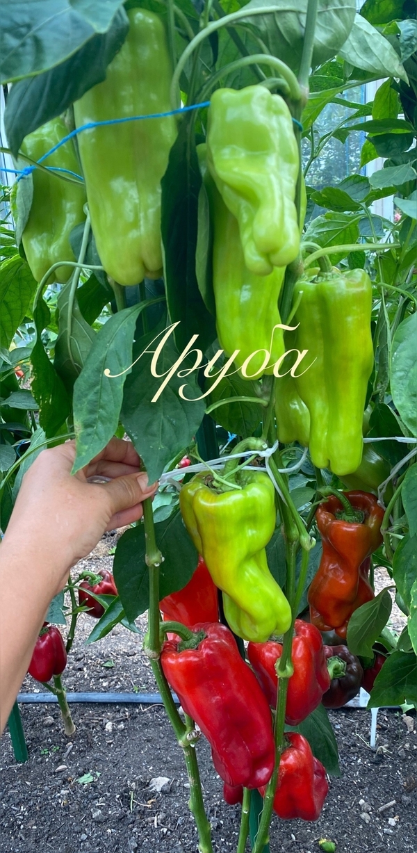 Высокорослый, ранний. Плоды длинной до 30 см., созревают от бледно-желтого до оранжево-красного цвета. Очень ароматный. Идеален для жарки, гриля, пиццы. Урожай потрясающий — куст стоит как на подпорках.