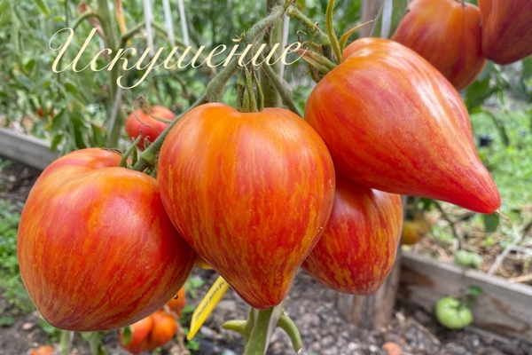 Еще один неповторимый сорт Софии , триколор, для любителей экзотических во вкусе, внешнем и внутреннем содержании. Вес 200-400, нижние кисти были со,значительно крупнее ,плодами , форма сердца разнообразная.